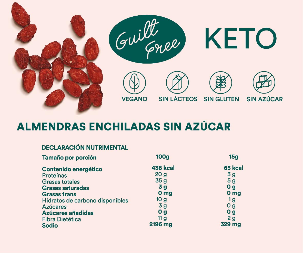Almendras, chamoy sin azúcar (agua, mezcla de chiles secos, estevia, limón deshidratado, sal de mar, ácido cítrico y goma de xantana), chile en polvo.